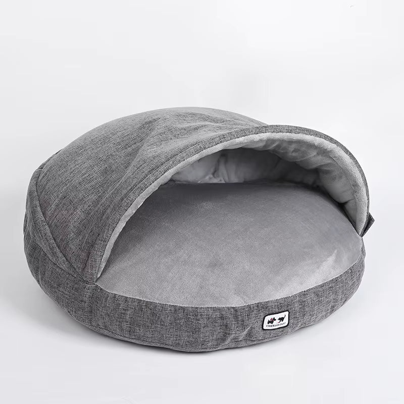 Made with soft plush fabric and high-density pearl cotton padding, the bed cushions joints and muscles while creating a warm, snug environment. The semi-enclosed top cover can stay upright for easy access or lie flat to provide a den-like hideaway—ideal for anxious pups or curious cats.